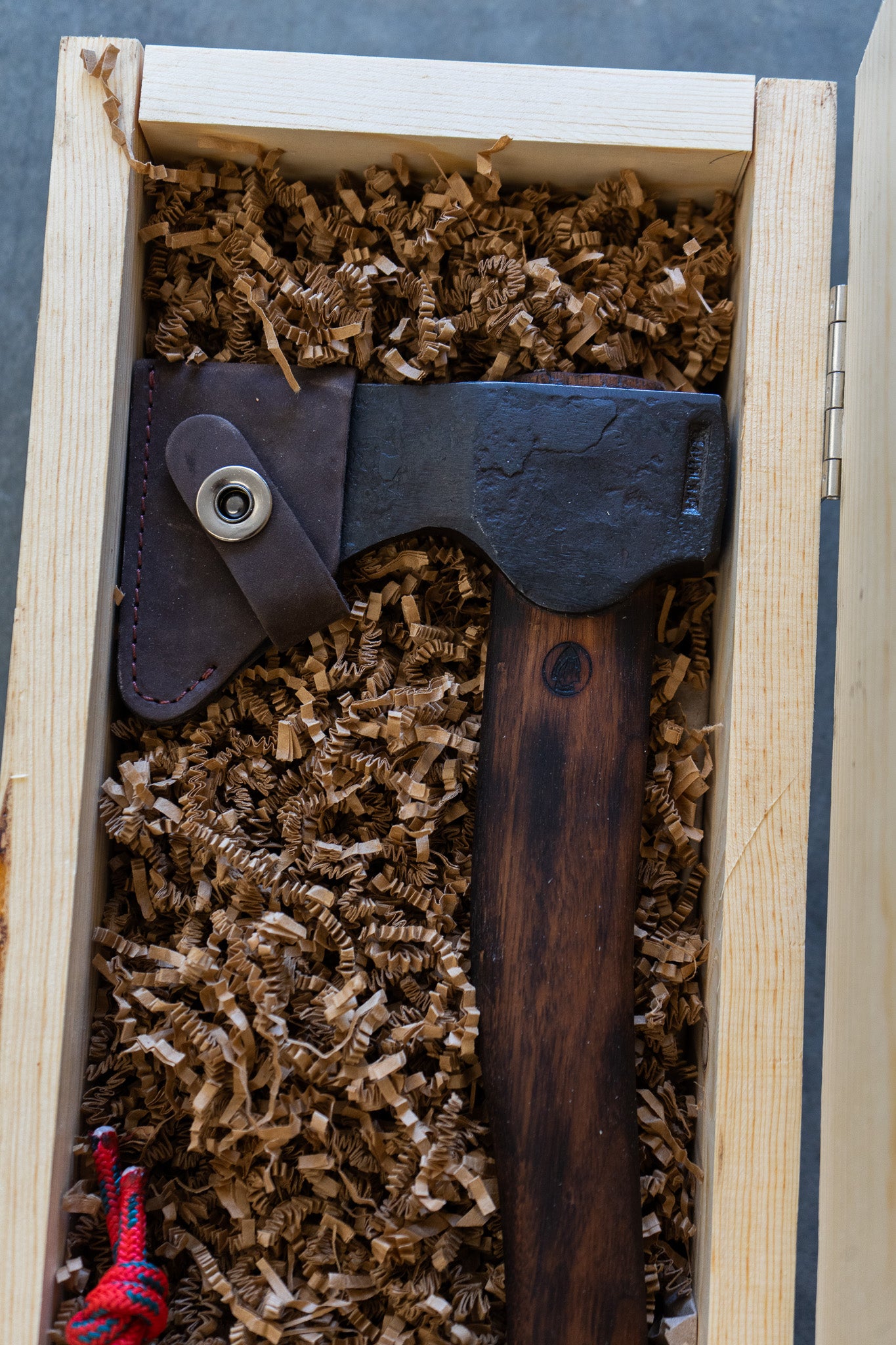 Along with each Benchmade Hatchet, comes a Benchmade Hatchet Box. Slater assembled these rugged boxes to store your hatchet in while at home.