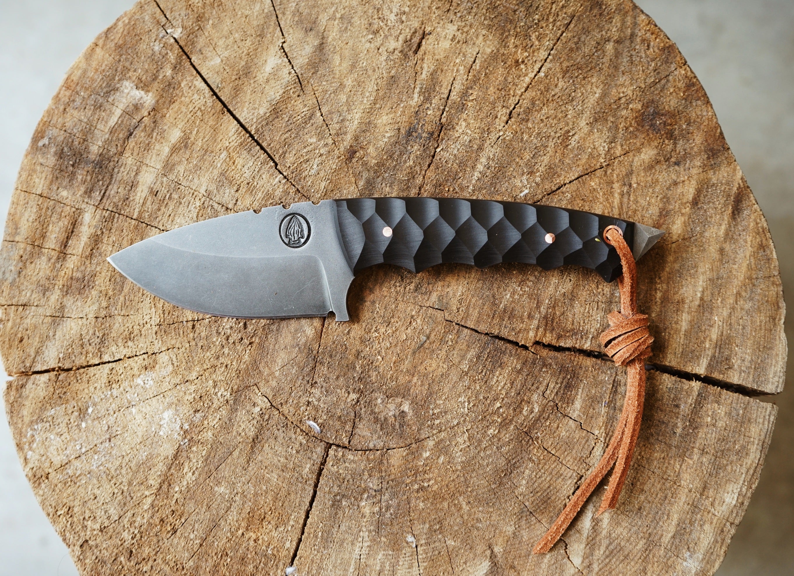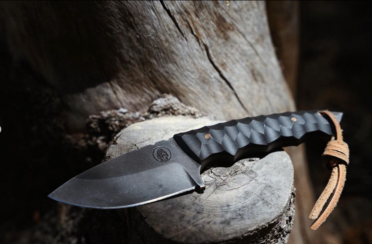 These knives showcase cutting-edge craftsmanship. They are expertly crafted from 3/16" thick 80crv2 steel, with a hardness rating of 58-60 Rockwell. The finishing touch is a gun blue stone wash, adding to their appeal. The handle is skillfully constructed using textured Black Diamond Richlite, a highly durable material. It features copper pins and a lanyard tube for added convenience.